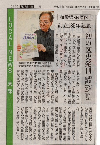萩原区史が発刊され、区民の皆様のお手元に配布されたことと思います。この度萩原区史作成委員会事務局を務められた山下様の計らいで、静岡新聞に記事が掲載されました。公民館で山下さんが取材を受けている時にたまたま居合わせた私に白羽の矢が立ち、撮影される羽目となりました。