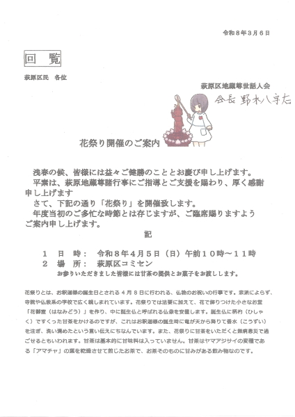 花祭りとは、お釈迦様の誕生をお祝いし「子供の身体健全・所願成就」を祈る仏教行事です。お子様にはお菓子をお配りしますので是非お参りに来てください。